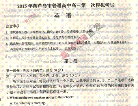 谷歌:《Ks5u首发》辽宁省葫芦岛市2015届高三第一次模拟考试 英语 扫描版含答案