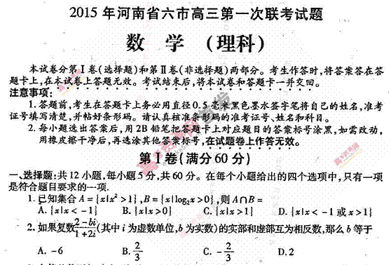 百度:《Ks5u名校首发》河南省六市2015届高三下学期第一次联考试题 数学(理) 扫描版含答案