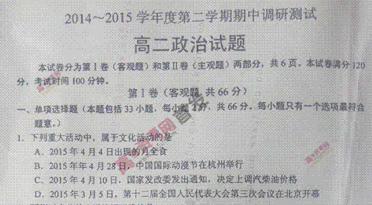 百度:《Ks5u首发》江苏省宿迁市2014-2015学年高二下学期期中考试 政治 扫描版含答案